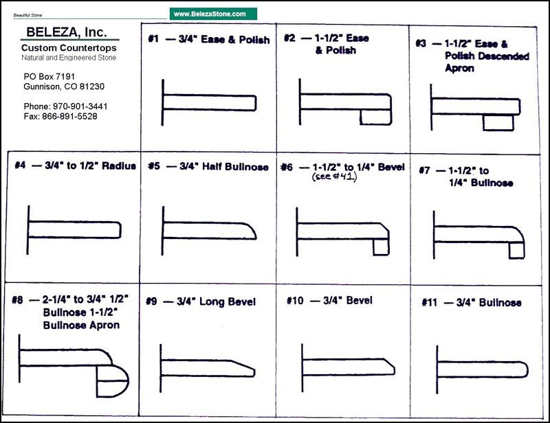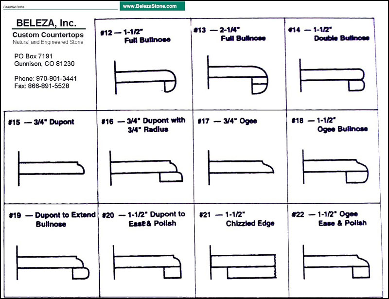 One of the most popular and most expensive edges is #21 chiseled. Some others are #18 ogee bull nose, #20 dupont, and #22 ogee.